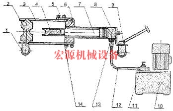 由電動(dòng)油泵(10),高壓油管(12),快速接頭(13),工作油缸(8),柱塞(7),彎管部件[包括上花板(3),下花板(14),模頭(4),輥軸(2)]組成。由電動(dòng)油泵輸出的高壓油,經(jīng)高壓油管送入工作油缸內(nèi),高壓油推動(dòng)工作油缸內(nèi)柱塞,產(chǎn)生推力,通過(guò)彎管部件彎曲管子 。